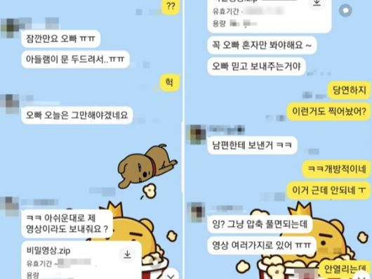 영상통화 중 갑자기 여성은 아들의 방해를 핑계로 급히 통화를 종료했고, 피해자에게 자신의 영상 파일이라며 APK 파일을 전송했다. A씨가 파일을 열었을 때 영상은 확인되지 않았고, 알 수 없는 오류가 발생했다. 이후 여성은 자신의 업무용 휴대폰이라며 새로운 카카오톡 계정을 통해 피해자에게 연락을 했고, 피해자의 신체 영상과 지인 연락처를 공개하며 유포 협박을 시작했다.
