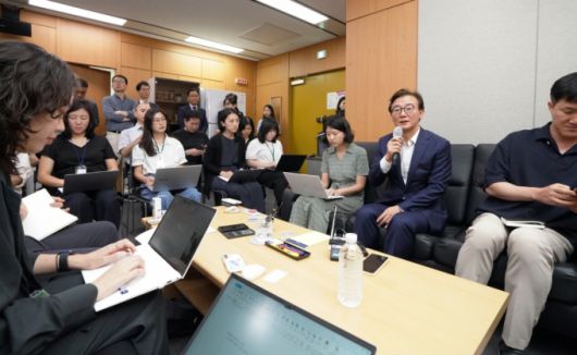 전재수 해수부 장관이 24일 취임식 후 곧바로 기자실에 내려와 기자들과 해수부 정책방향에 대한 간담회를 진행하고 있다./사진=해수부 제공. |