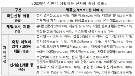 여름철에 사용이 많은 휴대용 선풍기, 제빙기 등 계절(하계) 제품군은 인체보호 기준 대비 12.05% 이하의 전자파가, 전기면도기와 전동칫솔 등 '생활 속 전자파 위원회'가 자체 선정한 제품군은 인체보호 기준 대비 4.74% 이하인 것으로 나타났다.