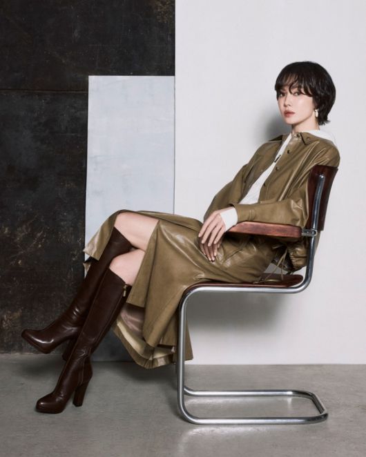 가을의 시크한 멋을 느낄 수 있는 카키베이지 컬러의 레더 착장에는 하이 부츠를 매치해 실용적이면서도 감각적인 도회적 무드를 연출했다.