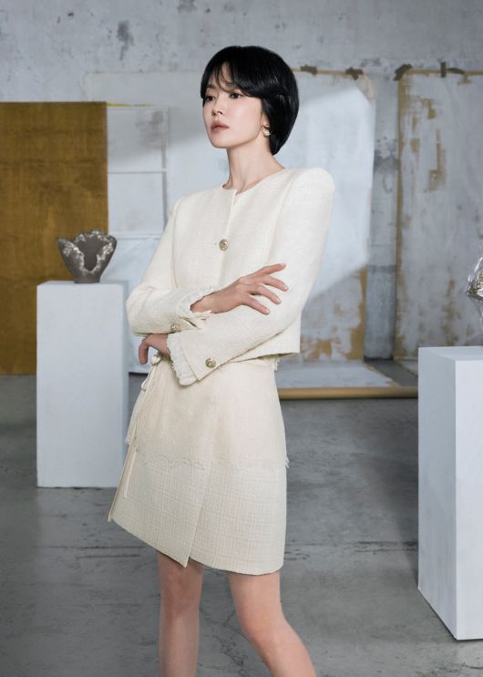 이 외에도 송혜교는 섬세한 디테일과 골드 버튼 포인트의 아이보리 트위드 셋업으로 클래식한 우아함을 강조했으며, 블루 그레이 컬러 수트 착장으로 세련된 실루엣과 미샤 특유의 정제된 무드를 선보이기도 했다.