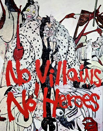 디즈니 애니메이션 '101마리의 달마시안 개' 속 악당 크루엘라를 그린 그림 위에 '악당도 히어로도 아닌'(No Villains No Heroes)이라는 문구가 적혀있다.