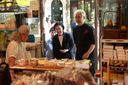 한성숙 중소벤처기업부 장관이 24일 오후 대전 유성구 은구비서로 골목형 상점가에서 상인들과 이야기를 나누고 있다. 중기부 제공 |