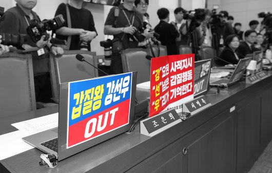 14일 국회 여성가족위원회에서 열린 강선우 여성가족부 장관 후보자에 대한 인사청문회에서 국민의힘 의원들이 강 후보자 사퇴를 요구하는 피켓을 부착하고 있다. 권도현 기자 |