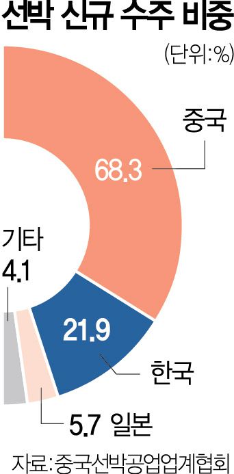 23일 중국선박공업업계협회는 상반기 중국의 신규 선박 수주 점유율이 68.3%로 지난해 같은 기간보다 6.4%포인트 떨어졌으나 글로벌 선두 지위는 유지했다고 밝혔다. 상반기 신규 수주 물량은 4422만 DWT(중량톤)로 지난해 같은 기간에 비해 18.2% 감소했다.