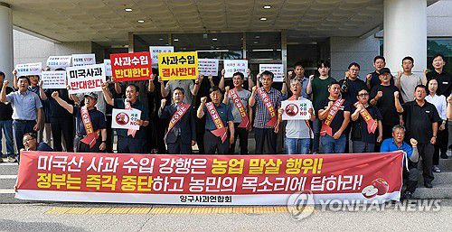 (양구=연합뉴스) 24일 강원 양구군 농업기술센터 앞에서 열린 미국산 사과 수입 반대 촉구 집회에서 서흥원 군수와 양구사과엽합회원들이 정부에 수입 철회를 요구하는 구호를 외치고 있다. 2025.7.24 [양구군 제공. 재판매 및 DB 금지]