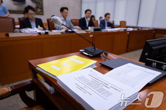 24일 서울 여의도 국회에서 열린 제427회 국회(임시회) 제4차 농림축산식품법안심사소위원회에 양곡관리법 등 심사자료가 놓여 있다. 농림축산식품법안심사소위원회는 이날 윤석열 정부가 재의요구권(거부권)을 행사한 '농업 4법' 중 양곡관리법(양곡법), 농수산물 유통 및 가격안정에 관한 법률(농안법) 등을 심사한다. 2025.7.24/뉴스1 ⓒ News1 유승관 기자 |