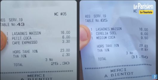 프랑스 언론 르파르지앵이 실시한 실험으로 같은 메뉴를 주문했으나 현지인(왼쪽)과 관광객(오른쪽)의 요금이 다르게 측정돼 있다. 르파르지앵 유튜브 |