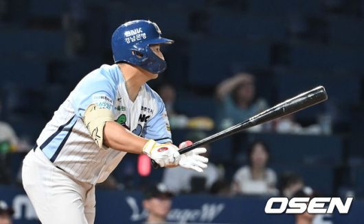 [OSEN=창원, 이석우 기자] 24일 창원NC파크에서 2025 신한 SOL 뱅크 KBO 리그 NC 다이노스와 KT 위즈의 경기가 열렸다. 홈팀 NC는 목지훈이, 방문팀 KT는 배제성이 선발 출전했다. NC 다이노스 오영수가 5회말 2사 1,3루 중견수 앞 1타점 안타를 치고 있다. 2025.07.24 / foto0307@osen.co.kr