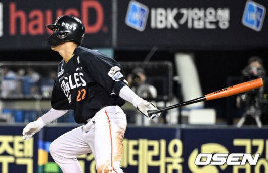 [OSEN=잠실, 조은정 기자]24일 오후 서울 잠실야구장에서 2025 신한 SOL Bank KBO리그 두산 베어스와 한화 이글스의 경기가 열렸다. 이날 두산은 최승용, 한화는 폰세를 선발로 내세웠다. 8회초 무사 1,2루 한화 채은성이 적시타를 날리고 있다. 2025.07.24 /cej@osen.co.kr