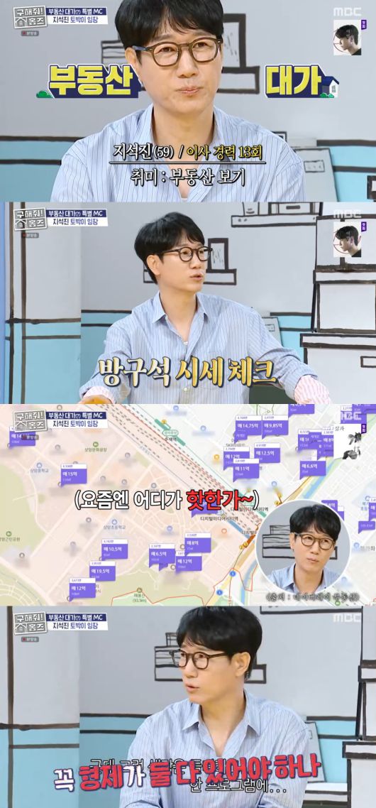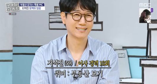 이날 지석진은 해외를 간 박나래를 대신해 등장했다. 지석진은 결혼 후 이사 경력만 13회이며, 취미가 집에 가서 2시간 3시간씩 부동산 보는것이라고 밝혔다.