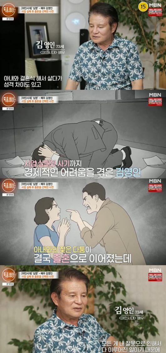 또한 김영인은 "결혼을 했다가 성격 차이도 있고 서로 기대하는 것에 실망이 커서 졸혼이 됐다"며 배우 생활 후 사업도 실패하며 아내와의 다툼이 잦아진 탓에 결별, 혼자 살고 있음을 밝혔다.