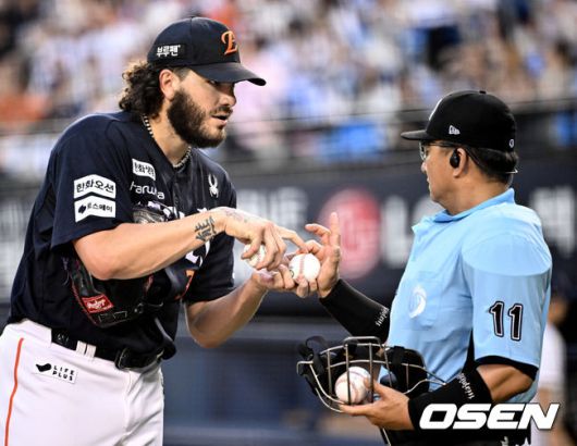[OSEN=잠실, 조은정 기자]24일 오후 서울 잠실야구장에서 2025 신한 SOL Bank KBO리그 두산 베어스와 한화 이글스의 경기가 열렸다.이날 두산은 최승용, 한화는 폰세를 선발로 내세웠다.한화 폰세가 5회말 마운드에 오르며 심판에게 공 교체를 요구하고 있다. 2025.07.24 /cej@osen.co.kr