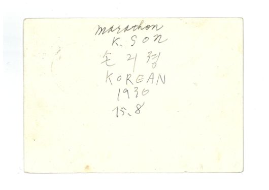 손바닥보다 작은 엽서 뒷면에 적힌 글씨, ‘Marathon K.Son 손긔졍 KOREAN 1936.15.8.’ 손기정(1912~2002) 선수가 1936년 베를린올림픽 마라톤 우승 엿새 후인 8월 15일 어느 독일 팬에게 해준 서명이다. 당시 시상대에서 불린 이름은 일본식인 ‘기테이 손(KITEI SON)’이었지만 그는 사인할 때마다 한글로 이름을 쓰거나 코리안이란 걸 강조했다. “어떻게 하면 내가 일본 사람이 아니라 조선 사람이라는 사실을 알리느냐”는 고민 때문이었다고 훗날 자서전(『나의 조국 나의 마라톤』, 1983)에서 밝혔다.