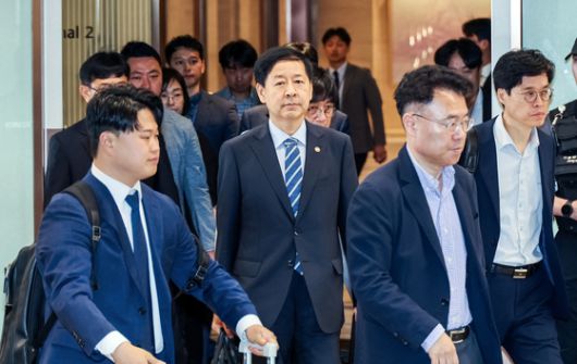 한·미 간 ‘2+2 장관급 회의’를 위해 24일 오전 출국하려던 구윤철 부총리 겸 기획재정부 장관(가운데)이 인천공항을 빠져나오고 있다. 기획재정부는 이날 “미국과 예정됐던 25일 ‘2+2 회의’는 스콧 베센트 미국 재무장관의 긴급한 일정으로 인해 개최하지 못하게 됐다”고 밝혔다. [연합뉴스] |