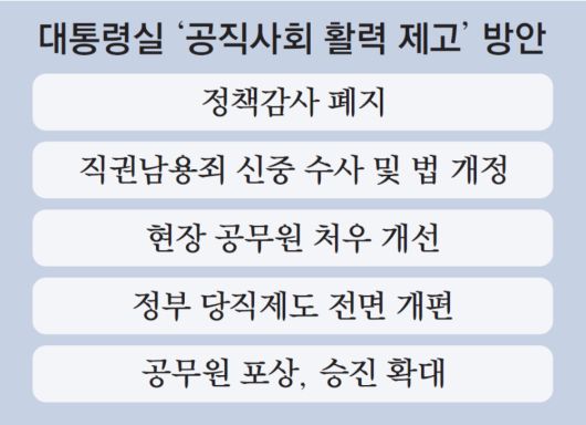 강훈식 대통령비서실장은 회의 직후 ‘공직사회 활력제고’ 브리핑을 열고 정책감사 폐지, 직권남용죄 신중 수사, 현장 공무원 처우 개선, 당직제도 전면 개편, 포상 확대 등을 100일 이내에 개선하겠다고 발표했다.