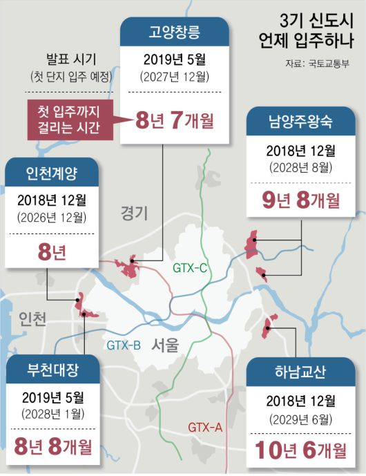 분양 자체가 2년 이상 지연되면서 입주 예정일도 연쇄적으로 늦춰졌다. 가장 속도가 빠른 인천계양은 2026년 12월 1100채 물량이 입주할 예정이다. 사업 발표부터 입주까지 약 8년이 걸리는 셈이다. 서울 강남 접근성이 우수해 주목받은 하남교산은 2029년 6월 입주가 예정돼 10년 6개월이 걸릴 것으로 보인다. 5개 지구 중 첫 입주가 가장 늦다. 고양창릉과 부천대장은 각각 8년 7개월, 8년 8개월이 소요될 예정이다.