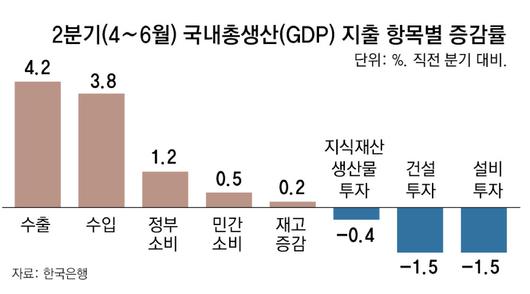 반면 건설업의 극심한 부진이 이어지면서 건설투자 부문은 1.5% 줄었다. 1분기(―3.1%) 대비 하락 폭이 줄었지만 5개 분기 연속 역성장을 면치 못했다. 설비투자도 반도체 제조용 기계나 운송장비 등에 대한 투자가 줄면서 1.5% 감소했다.