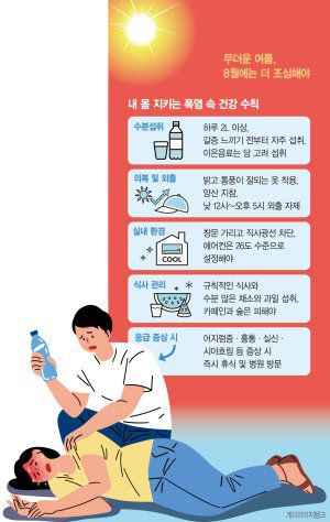 응급실을 찾지 않더라도 온열질환을 예방하기 위한 기본 수칙은 중요하다. △수시로 수분 섭취 △낮 12시~오후 5시 야외활동 자제 △밝고 통풍이 잘되는 옷 착용 및 그늘 활용 등이다.