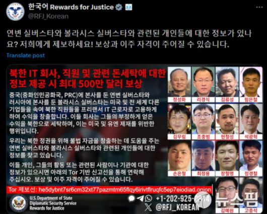 [뉴욕=뉴스핌]김근철 특파원=미국 정부가 북한의 사이버 범죄와 위조품 밀수, 암호화폐 탈취, 불법 IT 인력 파견 등을 통한 불법 수익 창출 활동 차단을 강화하기 위해 최대 1,500만 달러(약 206억 원)의 현상금을 내걸었다.