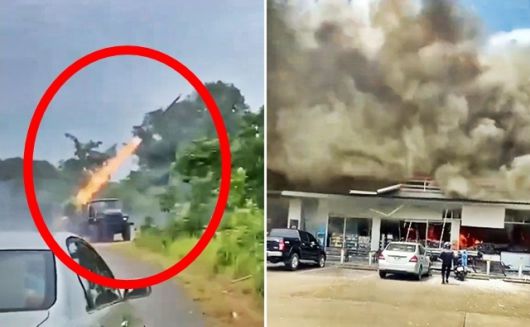 국경 문제로 갈등 중인 태국과 캄보디아는 24일(현지시간) 접경 지역에서 교전을 벌였다. 캄보디아는 러시아산 BM-21 다연장로켓포 등 중화기를 동원해 민간 지역까지 겨냥했고, 태국은 F-16 전투기 6대를 출격시켜 캄보디아군 지상 목표물을 공격하며 맞대응했다. 양국 간 모든 국경 검문소는 폐쇄됐다. 사진은 이날 캄보디아군이 로켓포를 쏘는 모습(왼쪽)과 캄보디아군 공격으로 태국 시사껫주 주유소 편의점에서 불길과 연기가 치솟는 모습. 편의점 안에 있던 학생 여럿이 사망한 것으로 전해진다. 2025.7.24 엑스 |