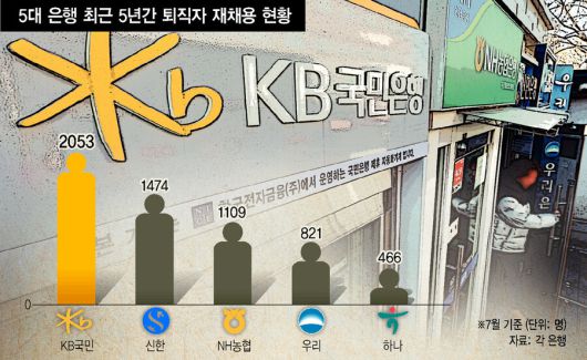 케이비(KB) 국민은행은 이달 들어 2015년 6월 이후 희망퇴직자를 대상으로 재채용 공고를 냈다. 자금세탁방지, 집단대출 업무지원, 금융사기 지급정지 및 피해구제, 비대면 가계대출 심사 등의 분야에서 일했던 이들이 대상이다. 5대 은행 중 국민은행이 퇴직자 재채용에 가장 적극적이다. 지난달 말까지 5년여 동안 모두 2053명의 희망퇴직자를 다시 고용했다. 이달 시작한 채용을 마무리하면 더욱 늘어난다. 5대 은행 중 가장 많은 숫자다.