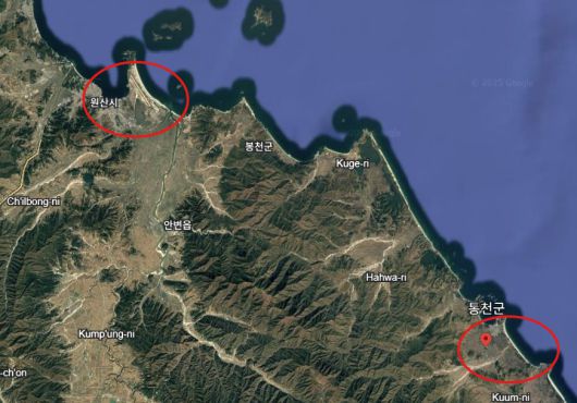 북한 강원도 원산 갈마해안지구와 통천군 해수욕장 위치. (구글어스 갈무리)