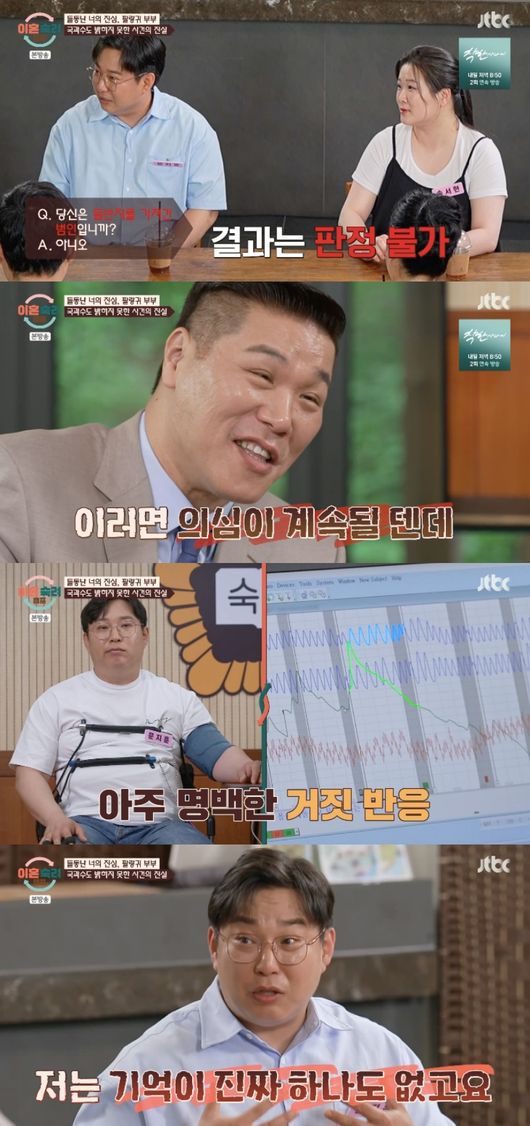애매한 결과에 남편은 “좀 아리송했다. 진실이면 더 좋은거겠지만 판정검사 나올 때 아쉬웠다”라고 이야기했다. 아내 역시 “범인이라고 한 게 너무 짜증나서 검사할 때 욱했다. 진짜 왜 판정 불가. 내가 진실로 나와야 내가 큰소리 뻥뻥 치고 다음 남편 결과를 기다릴텐데 찝찝하다”라고 털어놨다.
