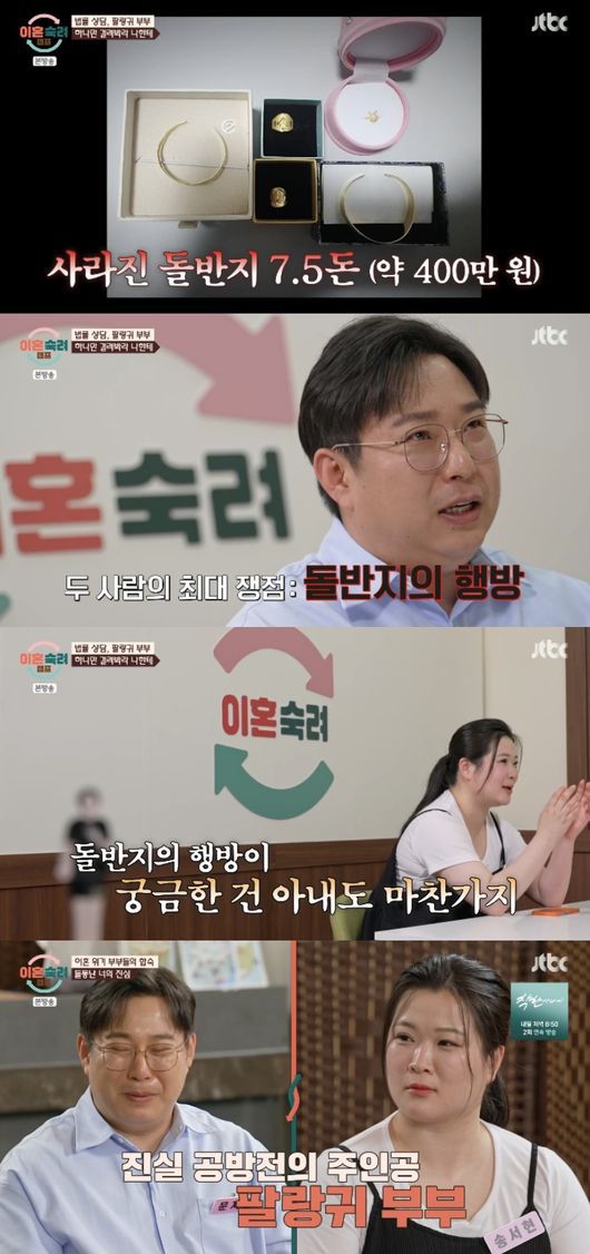 앞서 팔랑귀 부부는 아내가 벌인 일로 인해 채무 1억 빚을 지게 된 사실을 밝혔다. 심지어 아내는 남편 몰래 친모에게 받은 금목걸이 세트 예물부터 다이아 결혼 반지, 커플링, 진주 귀걸이 등 다양한 고가의 물품들을 팔았다고. 이에 남편은 약 400만 원 가량의 없어진 돌반지 총 7.5돈 역시 아내가 훔쳐갔다고 의심하고 있다고 밝혔다.