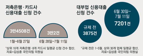 이에 비해 대부업 대출 신청 건수는 급격히 증가했다. 김 의원실에 따르면 상위 30개 대부업체의 규제 전(1~5월)의 일평균 대출 신청 건수는 3875건이었으나 규제 이후(6월 30일~7월 11일)엔 7201건으로 85% 늘어났다. 같은 기간 대출 승인율은 16.5%에서 12.8%로 3.7%포인트 떨어졌다.