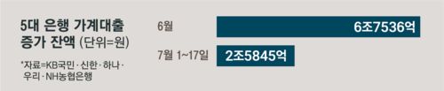 24일 5대 시중은행(KB국민·신한·하나·우리·NH농협은행)에 따르면 이달 1~17일 가계대출은 2조5845억원 증가했다. 지난 6월 같은 기간(3조7609억원)에 비해 31% 감소한 수치다. 이달 전체 증가액도 지난달(6조7536억원)의 70% 수준인 4조~5조원대에 머무를 것으로 예상된다.