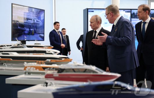 블라디미르 푸틴 러시아 대통령이 19일(현지시간) 상트페테르부르크에 있는 드론 제조 공장을 데니스 만투로프 제1부총리와 방문을 하고 있다. 2025.02.20 ⓒ 로이터=뉴스1 ⓒ News1 우동명 기자 |