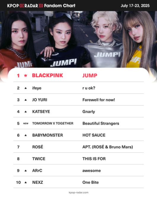 ‘케이팝레이더’ 위클리 팬덤 차트는 한 주간 어떤 아티스트가 많이 성장했는지를 보여주는 증감률 기반 차트다. 25일 발표된 이번 차트에서 블랙핑크는 디지털 싱글 ‘뛰어’로 지난주에 이어 또 다시 정상에 올랐다.