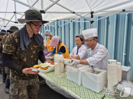 침수 피해 복구가 한창인 전남 나주시에서 지난 24일 안유성 명장이 복구 작업에 참여한 군 장병에게 식사를 제공 중인 모습. /사진=뉴스1(대한적십자사 제공) |