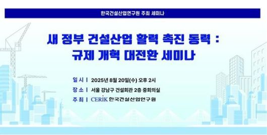 25일 건설산업연구원은 오는 8월 20일 서울 강남구 건설회관에서 '새 정부 건설산업 활력 촉진 동력 : 규제 개혁 대전환 세미나'를 개최한다고 밝혔다.