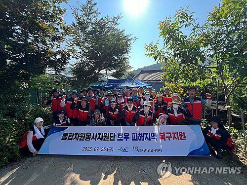 (속초=연합뉴스) 25일 경기 가평군 조종면 일원에서 수해 복구 봉사 활동을 마친 속초시와 속초시자원봉사센터 자원봉사자들이 단체 사진을 찍고 있다. 2025.7.25 [속초시 제공. 재판매 및 DB 금지]