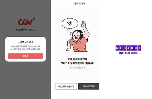 하지만 이날 오전 10시 5분쯤부터 영화관 주요 3사 앱은 모두 접속이 어려운 상황이다. CGV 앱은 접속하면 ‘시스템 오류 안내’ 문구가, 롯데시네마는 ‘접속자가 많아 서비스 이용이 원활하지 않습니다’, 메가박스는 ‘웹페이지를 사용할 수 없음’ 등의 문구가 나타나고 있다. 홈페이지 접속은 앱과 비교하면 상대적으로 원활한 편이나 이 역시 지연되고 있다.