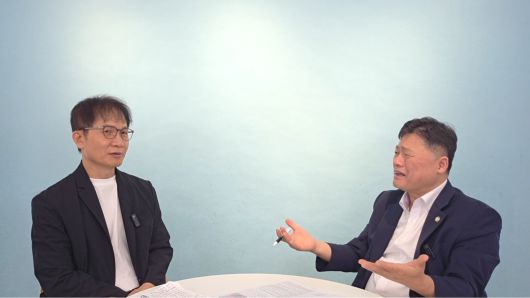 뉴스타파와 인터뷰 중인 박정훈 대령 변호인 김정민 변호사(오른쪽)와 조성식 뉴스타파 전문위원.