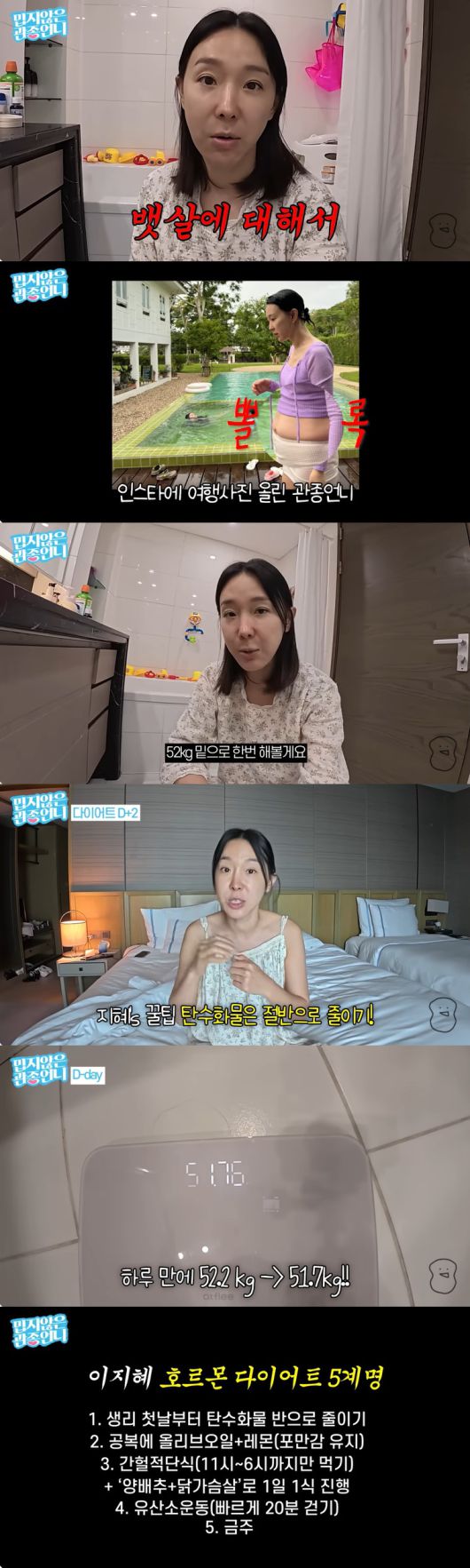 "옷만 잘 가리면 사실 찐 줄 모르고, 수영복 같은 걸 입으면 적나라하게 드러나는데 제가 현실을 마주한 거다"던 이지혜는 52kg 아래까지 감량을 결심했고, 이후 "호르몬의 흐름을 이용한 약 없이 빼는 비법"이라고 말해 눈길을 끌었다.