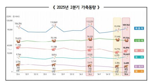 반면 산란계는 7772만 4000마리로 전년(7822만 5000마리)보다 50만 1000마리(0.6%) 감소했다. 6개월 이상 마릿수는 전년보다 2.0% 증가했지만, 3개월 미만은 6.2%, 3~6개월 미만은 8.7% 줄면서 전체 규모가 감소했다.
