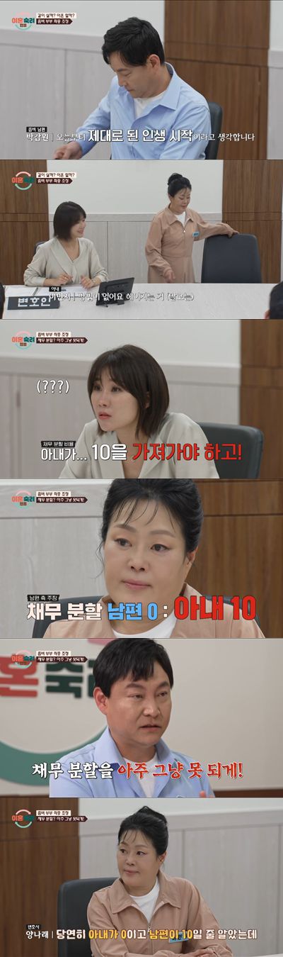 가장 먼저 재산 분할에 관한 조정이 시작됐다. 남편 측의 박민철 변호사는 "먼저 말씀을 드리면 채무(2천만 원)를 분할해야 하는 상황이다. 남편분이 이건 아내가 10을 가져가야 하고, 남편은 부담할 게 없다고 생각하셨다"고 해 조정장을 술렁이게 했다.