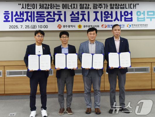 광주시는 광주시의회, 한국전력공사 광주전남본부, 한국승강기안전공단 호남지역본부와 함께 25일 시의회 대회의실에서 '승강기 회생 제동장치 설치 지원 사업 추진을 위한 업무협약'을 체결했다.