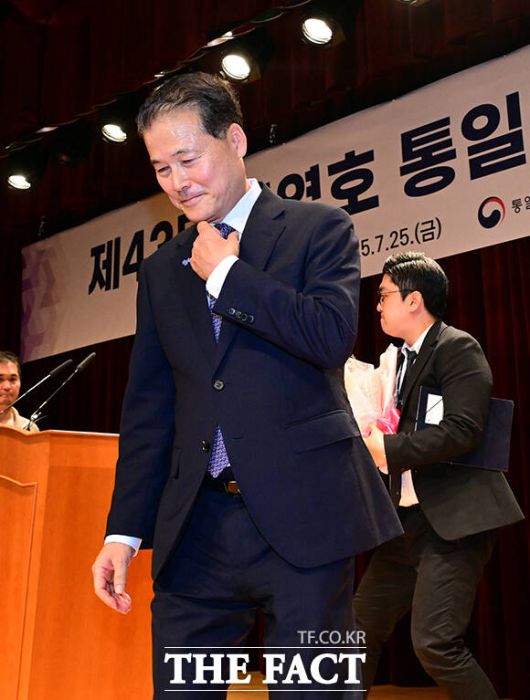 [더팩트ㅣ임영무 기자] 김영호 통일부 장관이 25일 오후 서울 종로구 정부서울청사 별관에서 열린 이임식을 마친 뒤 단상을 내려가고 있다.