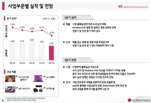 LG전자는 "전사 매출액과 영업이익은 주요 시장 수요부진에 미국 통상정책 변화에 따른 관세 부담과 시장 경쟁 심화 등 비우호적 경영환경이 이어지며 전년동기대비 줄었다"라며 "물류비 등 전년 대비 증가한 비용 요인에도 영향을 받았다"라고 설명했다.