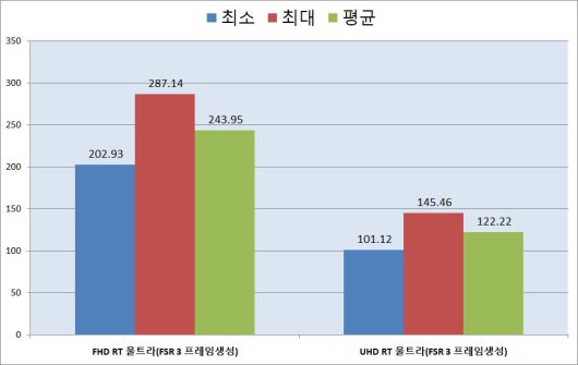 레이트레이싱 울트라 옵션에 FSR 3 프레임 생성으로도 벤치마크를 진행했다. FHD 해상도의 경우 최소 202.93FPS 최대 287.14FPS 평균 243.95FPS를 기록했다. 4K UHD 해상도에서는 최소 101.12FPS 최대 145.46FPS 평균 122.22FPS를 기록했다.