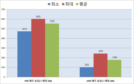 '오버워치 2'는 매우 높음 옵션에 렌더링 스케일 100% 설정으로 훈련장에서 측정을 진행했다. FHD 환경에서는 최소 473FPS 최대 602FPS 평균 554FPS로 측정됐다. 해상도를 4K UHD로도 설정했는데 최소 102FPS 최대 244FPS 평균 178FPS로 측정되었다.