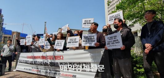 2023년 4월 21일 오전 인천지법에서 전세사기·깡통전세 피해자 전국대책위원회와 전세사기·깡통전세 문제 해결을 위한 시민사회대책위원회 관계자들이 법원과 판사에 경매 기일 직권 변경을 촉구하며 구호를 외치고 있다. 지홍구기자 |
