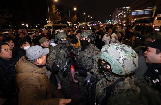 지난해 12월 4일 새벽 서울 여의도 국회 앞에서 시민들이 경내로 진입하려는 계엄군을 붙잡아 막아서고 있다. 2024.12.4/뉴스1 |