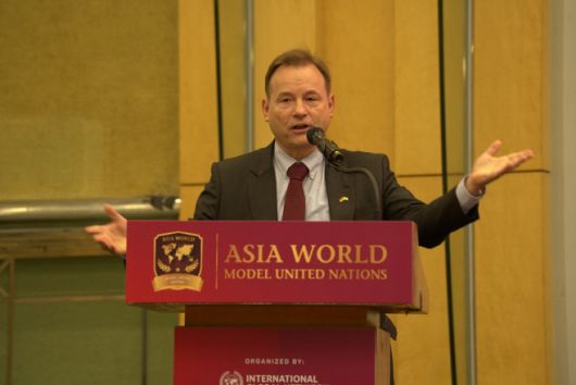 게오르크 빌프리드 슈미트 주한독일대사는 25일 서울 스위스 그랜드호텔에서 열린 AWMUN 2025 개회식 기조연설에서 "여러분의 시야를 벗어나 세상 밖으로 나가라. 낯선 곳으로 가고, 다른 문화를 직접 경험하라"고 청년들에게 조언했다.