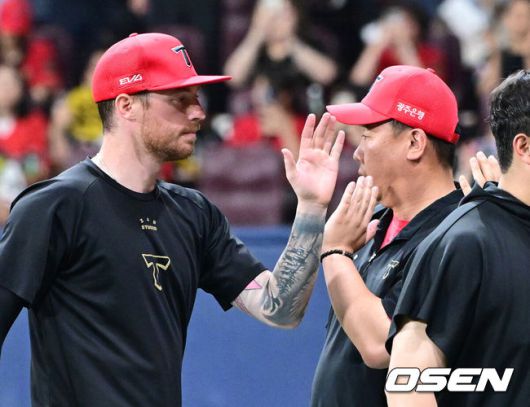 [OSEN=고척, 최규한 기자] 프로야구 KIA 타이거즈가 키움 히어로즈를 꺾고 전날 패배를 설욕했다.KIA는 25일 서울 고척 스카이돔에서 열린 2025 KBO리그 키움과의 경기에서 6-3으로 승리했다.KIA 선발 올러는 6이닝 동안 5피안타 1볼넷 5탈삼진 2실점 퀄리티 스타트로 시즌 8승째를 기록했다.경기를 마치고 승리투수 KIA 애덤 올러와 이범호 감독이 인사를 나누고 있다. 2025.06.25 / dreamer@osen.co.kr |